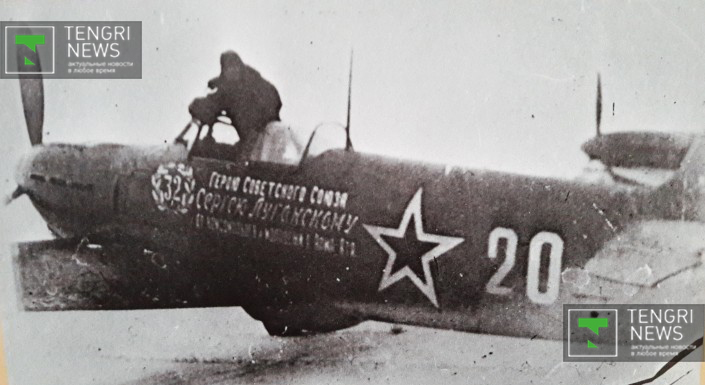 В 1943 году комсомольцы Алма-Аты подарили дважды Герою Советского Союза С. Луганскому самолет. Фото: Центральный государственный архив кинофотодокументов и звукозаписей РК.