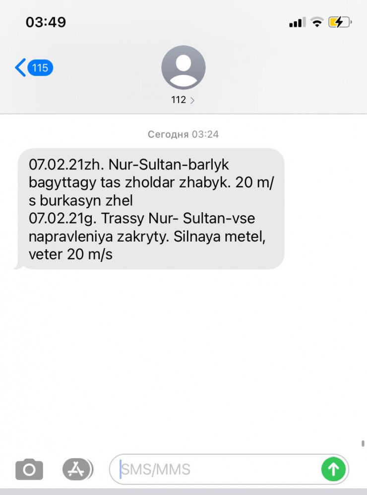 7 февраля диспетчерская служба Департамента по чрезвычайным ситуациям отправила сообщение о закрытии трасс Нур-Султана по всем направлениям из-за сильной метели и ветра 20 метров в секунду.