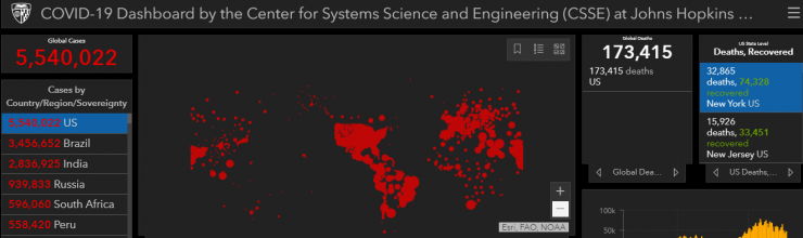 Лидирует в мире по количеству заболевших США - 5 540 022 человек. Общее количество смертей - 173 415. Выздоровевших - 74 328 человек. Число погибших от COVID-19 в США почти равно совокупному количеству погибших в Бразилии, Индии и России, которые занимают второе, третье и четвертое место соответственно.