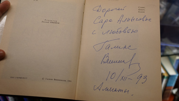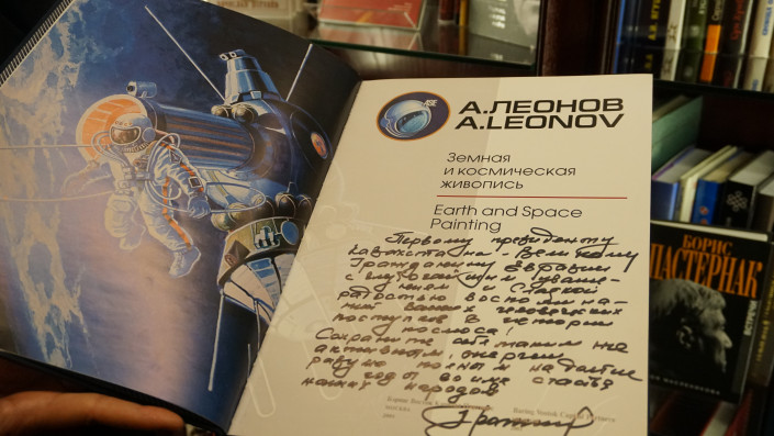 Среди них труды с личными автографами космонавта Алексея Леонова, писателей, поэтов и артистов - Чингиза Айтматова, Расула Гамзатова, Иосифа Кобзона, Галины Вишневской.