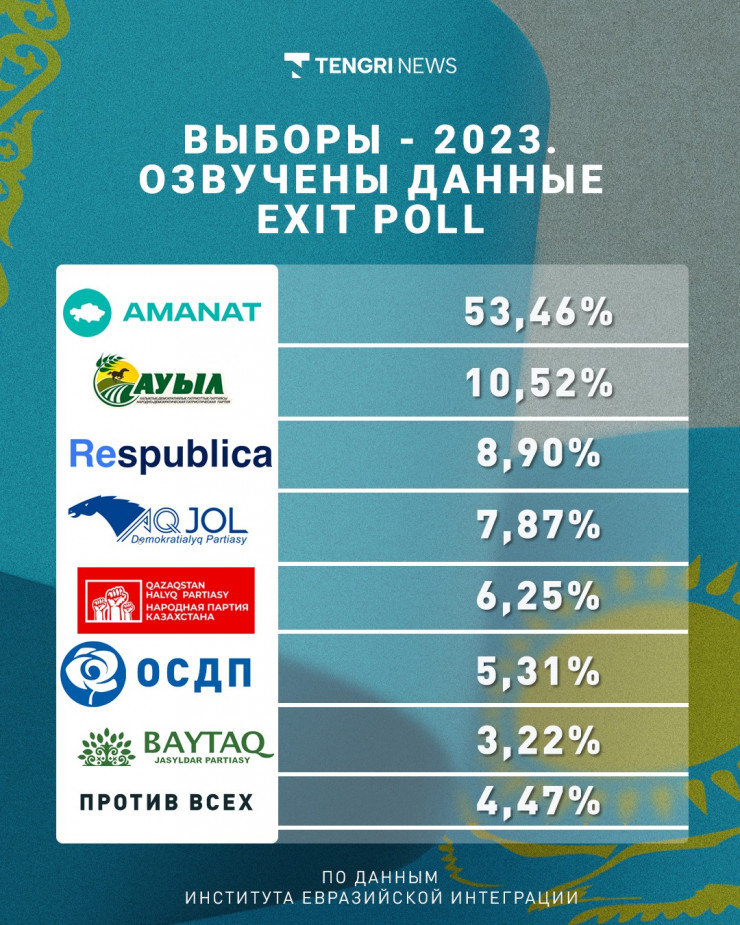 Озвучены результаты экзитполов на выборах депутатов Мажилиса. Данные опроса Института евразийской интеграции объявлены на онлайн-марафоне телеканала Qazaqstan, передает корреспондент Tengrinews.kz.