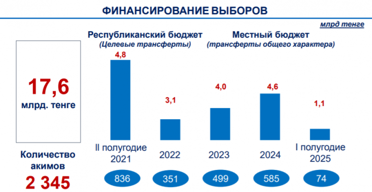 "Финансирование прямых выборов акимов будет осуществляться через местные бюджеты. Однако, учитывая нормы Бюджетного кодекса об обязательной компенсации потерь местного бюджета в период действия трансфертов общего характера, в ближайшие два года выборы будут финансироваться через ЦИК. С 2023 года эти расходы будут включены в базу расходов местных бюджетов и будут учтены при расчете в трансфертах общего характера.