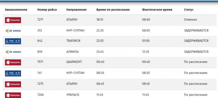 Вылеты задерживаются из Актау в Тбилиси, Алматы и Нур-Султан. Рейс в Атырау отменен, передает Tengrinews.kz.