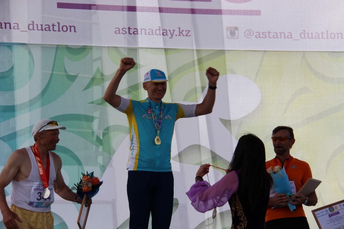 По итогам дуатлона в категории "51 и старше" победителем стал Болат Жамишев. Его результат 1 час и девять минут. Напомним, в 2015 году он взял "золото" на марафоне-2015 в Алматы. Жамишев пробежал 42,195 километра за 4 часа 3 минуты 54 секунды. Среди мужчин он занял 82-е место, однако в своей возрастной категории "55-59" он оказался на первом месте.