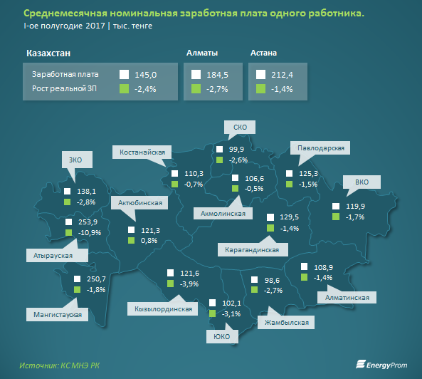 В региональном разрезе сохранить и даже немного увеличить реальный уровень заработных плат сумели только работодатели Актюбинской области: +0,8 процента за год. Номинальный рост составил +7,7 процента, до 121,28 тысяч тенге по итогам I полугодия.