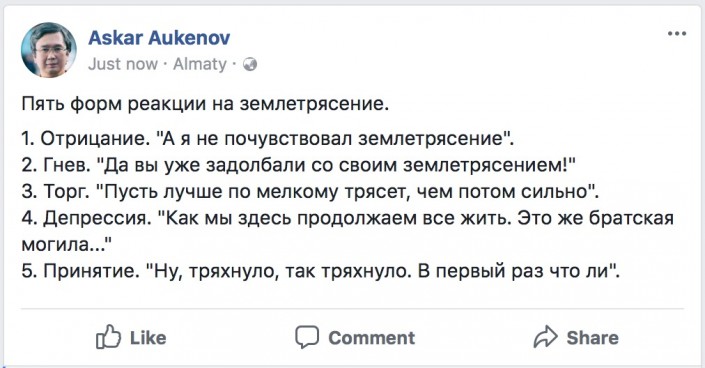 Пользователи социальных сетей разместили шуточные посты о произошедшем землетрясении в Алматы, передает корреспондент Tengrinews.kz