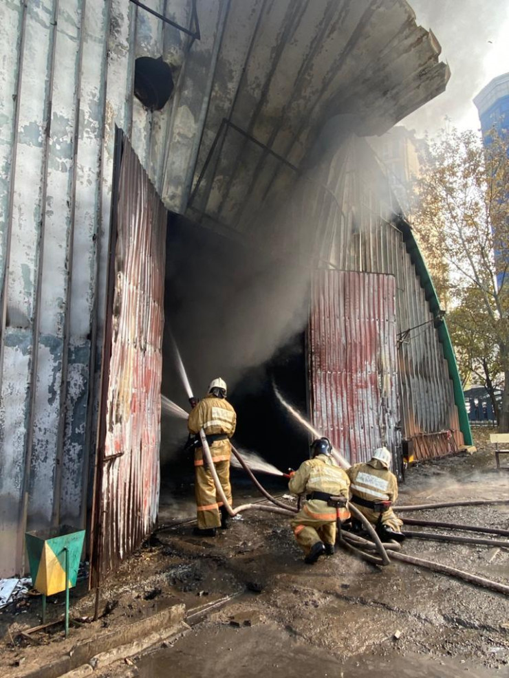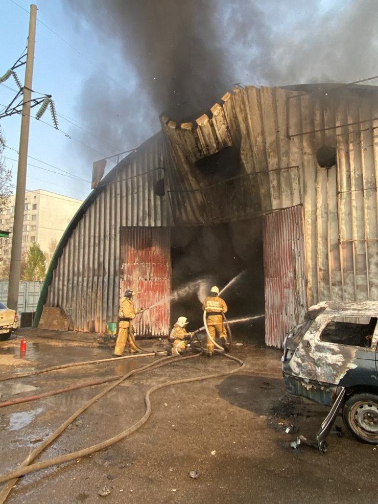"27 октября в 12.56 силы и средства ДЧС выехали по повышенному рангу вызова в Ауэзовском районе, микрорайон Аксай-1А. По прибытии выяснилось, что открытым пламенем горит отдельно стоящая СТО ангарного типа. К ней поданы пожарные стволы.
