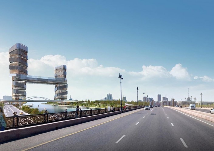 По замыслу авторов, одна башня символично расположится на правом берегу столицы, вторая - на левом, а посередине протянется конструкция длиной 100 метров со стеклянным полом, на которой посетители будут рассматривать проплывающие внизу пароходы, попивая кофе.