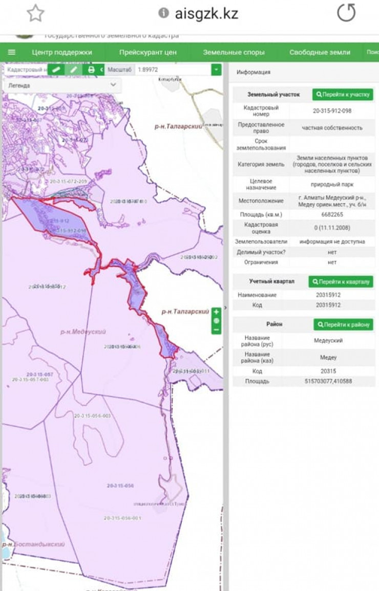 "Необходимо отметить, что земельный участок, занятый уникальным природным парком, в соответствии со статьей 34 Земельного кодекса предоставлен правительством страны ГРПП "Медеу" как государственному землепользователю на право постоянного землепользования. Но в базе АИС ГЗК отчетливо читается "частная собственность", что подразумевает под собой право частной собственности на землю. Учитывая то обстоятельство, что базу АИС ГЗК просто так не заполняют и в базу вводятся идентификационные сведения о земельном участке после государственной регистрации и выдачи идентификационного документа, то возникает вопрос: как и почему? При этом последняя кадастровая оценка земельного участка была сделана 11 ноября 2008 года!" - говорится в посте.
