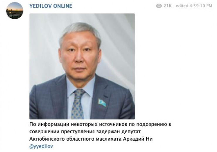"По факту задержания депутата маслихата Аркадия Ни по подозрению в совершении противоправных действий сообщаем, что комиссия партийного контроля рекомендовала рассмотреть вопрос о лишении его партийного билета Nur Otan.