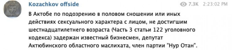 Ранее в соцсетях и ряде СМИ появилась информация, что в Актобе по подозрению в половом сношении или иных действиях сексуального характера с лицом, не достигшим шестнадцатилетнего возраста, задержан некий известный бизнесмен.