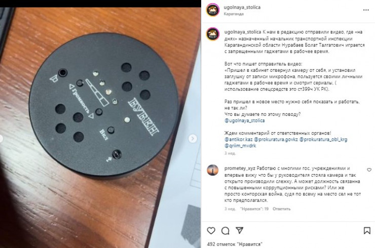 В конце октября в Instagram, на странице Ugolnaya_stolica, был размещен пост с видео от пользователя. Отмечается, что видеозапись была сделана якобы в кабинете недавно назначенного начальника транспортной инспекции Карагандинской области Болата Нурабаева. Кадры были сняты в присутствии начальника инспекции транспортного контроля области и его коллег. Последние обвинили своего шефа в том, что он установил в служебном кабинете запрещенные гаджеты.