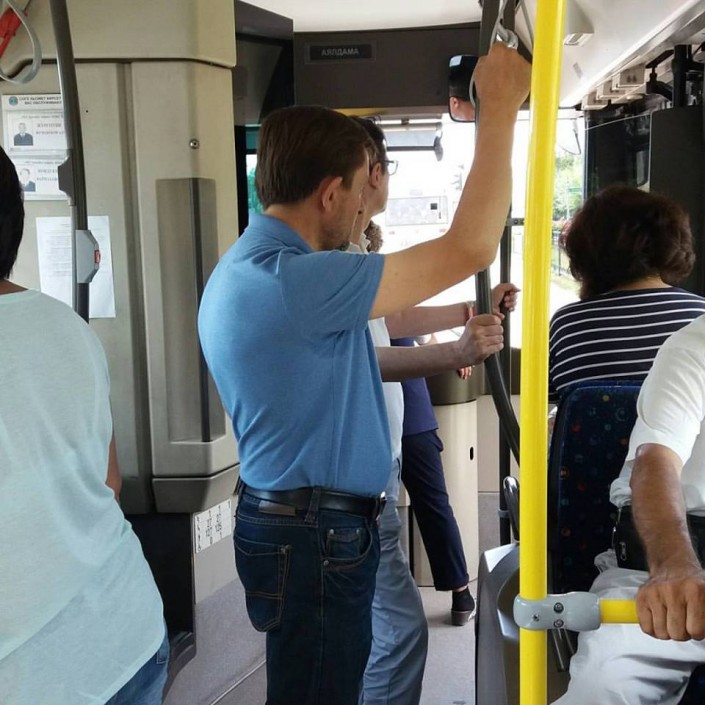 Снимок с Сергеем Хорошуном опубликовал пользователь Facebook. Первый заместитель Асета Искешева, как оказалось, ехал на автобусе не на работу.