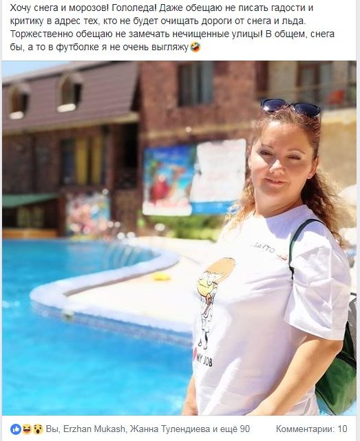 "Хочу снега и морозов! Гололеда! Даже обещаю не писать гадости и критику в адрес тех, кто не будет очищать дороги от снега и льда. Торжественно обещаю не замечать нечищеные улицы! В общем, снега бы, а то в футболке я не очень выгляжу", - написала Марина.
