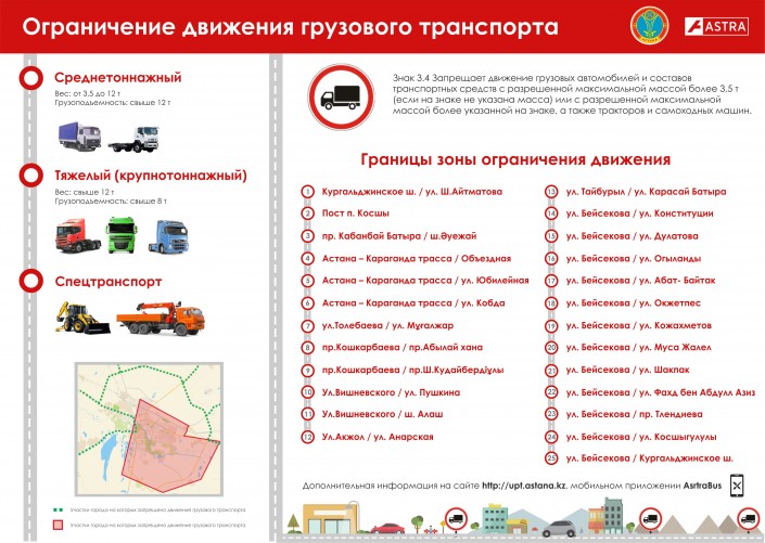 "Еще одним решением разгрузки транспортной сети города в период проведения международной специализированной выставки EXPO-2017 станет ограничение движения для грузовых транспортных средств. C 7 июня по 12 сентября 2017 года с 6.00 до 23.00 будет введено ограничение движения для всех типов грузового транспорта с разрешенной максимальной массой более 3,5 тонны, за исключением промышленной зоны", - сказал Игенбердинов на брифинге по вопросам транспортного обеспечения.