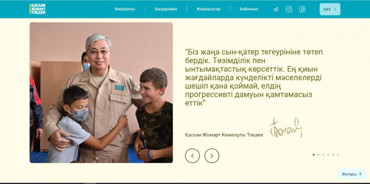 Структурно сайт поделен на несколько разделов. Первые три страницы погружают пользователя в историю деятельности Касым-Жомарта Токаева с 2019 года на посту Президента страны.