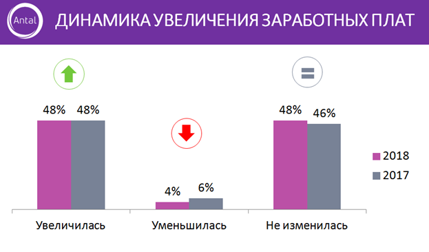 По результатам опроса 1 035 респондентов, начиная от простых специалистов до топ-менеджеров, 48 процентов из них рассказали о росте зарплат.