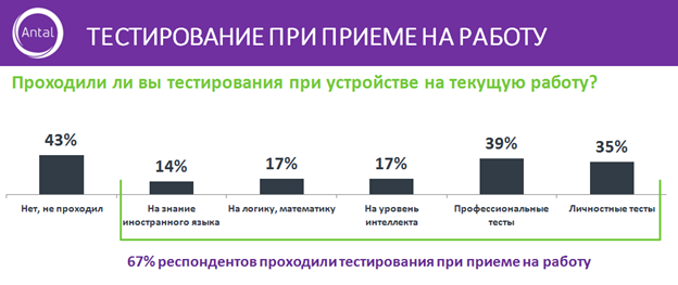 "Работодатели сегодня охотнее набирают сотрудников и принимают решения о найме быстрее, что не может не радовать. При этом требования к кандидатам со стороны работодателей продолжают расти. Компании стали более тщательно подбирать кандидатов. В связи с этим все большей популярностью пользуются различные тестирования при приеме на работу. 67 процентов участников исследования ответили, что проходили тестирования на различных этапах приема на работу", - говорит руководитель рекрутинговой компании Antal в Казахстане.