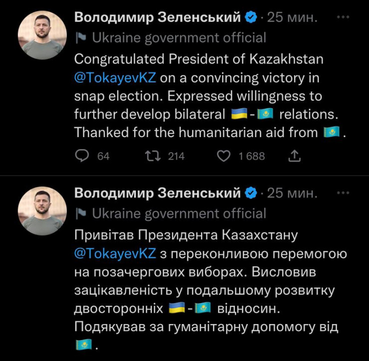"В ходе телефонного разговора поздравил Президента Казахстана Касым-Жомарта Токаева с убедительной победой на внеочередных выборах. Выразил заинтересованность в дальнейшем развитии двусторонних отношений. Поблагодарил за гуманитарную помощь от Казахстана", - написал Зеленский в Twitter.
