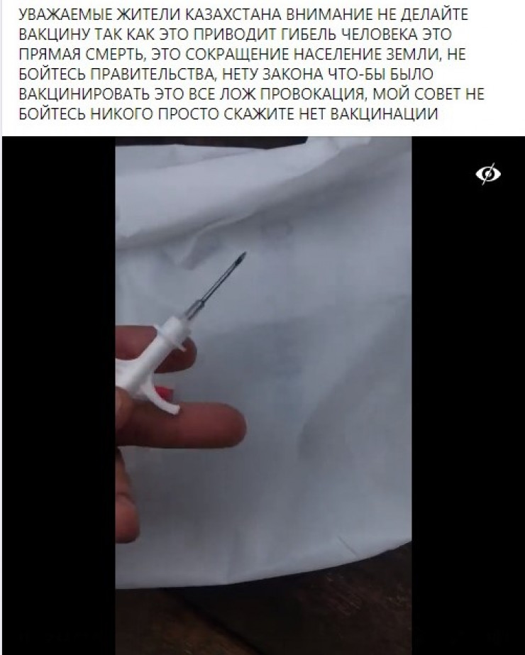 Желіде Қазақстанның барлық тұрғындарына арналған тағы бір "видеоескерту" тарады. Роликтің авторы чиптері бар шприцтерді камераға түсірген. Кадр сыртындағы адам мұндай вакцинациядан кейін "адам қайтыс болатынын" айтады.