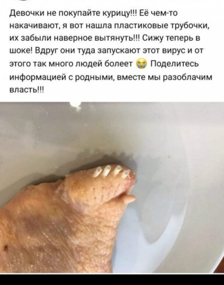 Бұл фото желіде бір жыл бұрын пайда болған. Алдымен "түсініксіз түтіктер" туралы Украина тұрғыны пост жазған. Бірақ оның болжамдары коронавирусқа қатысты болмады. Оның пайымдауынша, құстың салмағын арттыру үшін су құйған.