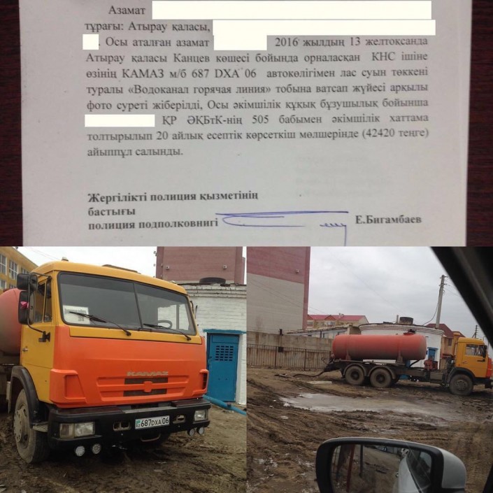 В сентябре 2016 года маслихат Атырауской области принял постановление, согласно которому водители вакуумных машин, сливающие отходы в городской черте, будут подвержены административному наказанию по статье 505 КоАП РК "Нарушение правил благоустройства города".