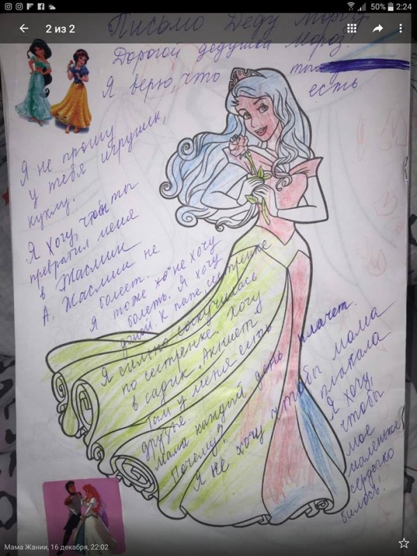 "Дорогой Дедушка Мороз, я верю, что ты есть. Я не прошу у тебя игрушек и кукол. Я хочу, чтобы ты превратил меня в Жасмин, а Жасмин не болеет. Я тоже не хочу болеть, я хочу домой, к папе, к сестренке, я сильно соскучилась по сестренке. Мама каждый день плачет. Почему? Я не хочу, чтобы мама плакала, я хочу, чтобы мое маленькое сердечко билось", - говорится в послании, которое растрогало жителей города.