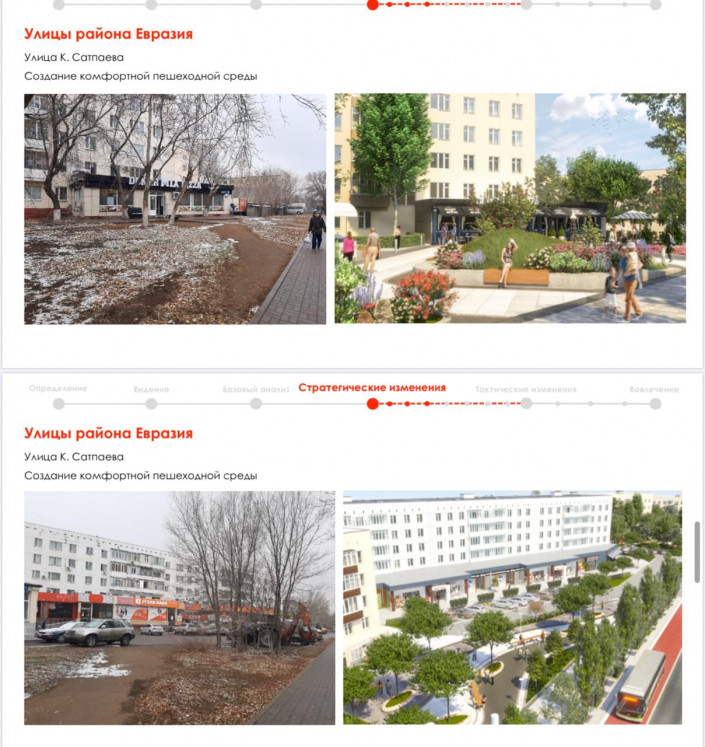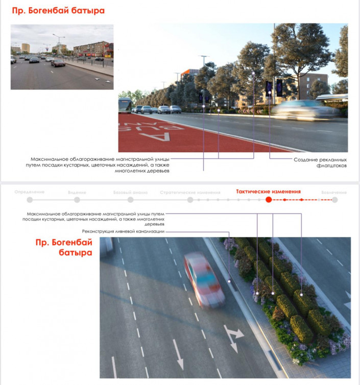 "К примеру, барьером между разными центрами притяжения является отсутствие мостов над рекой. Планируем увеличить количество связующих мостов: это по проспекту Тауелсиздик, Улы дала, также нужны развязки на пересечении шоссе Коргалжын, проспекта Кабанбай батыра и проспекта Туран. Акцент сделан на создании комфортной пешеходной среды. К примеру, на улице Бейбитшилик расширим и благоустроим пешеходные зоны, откроем уютные мини-кафе, будет больше зеленых насаждений. Район Евразии тоже охватим на первом этапе. По такому принципу преобразим и другие улицы, установим арт-объекты", - сказал Асхат Садуов.
