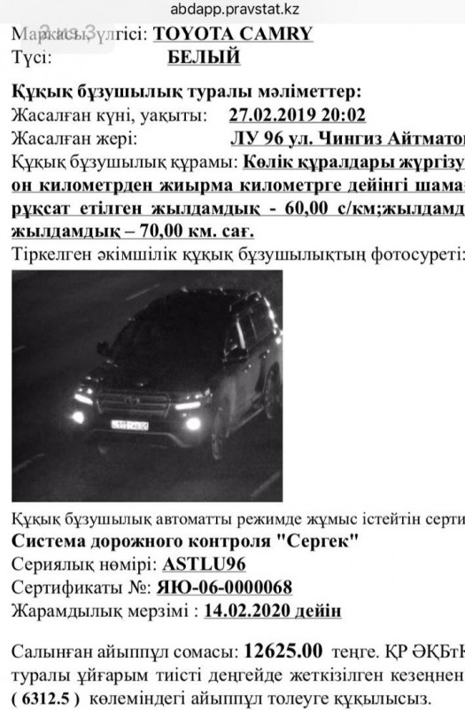 "Прям аккурат перед Международным женским днем мне прислали такой "подарок". Я не столько расстроилась, сколько была возмущена. В сообщении была ссылка на штраф на сайте "Камкор" - это был штраф с камеры "Сергек". Все данные моего автомобиля указаны верно, но на фотографии был совсем другой автомобиль с другим цветом и другими габаритами. Так как это были праздничные дни, у меня и времени не было разбираться, да и длинные выходные были. Все отдыхали", - поделилась Айдана.