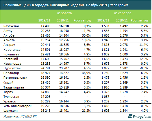 Серебряные ювелирные изделия подорожали на 2,7 процента за год, до 1,5 тысячи тенге по итогам ноября 2019-го. Дороже всего они стоят в Атырау (2,3 тысячи тенге, +11,4 процента за год), Нур-Султане (две тысячи тенге, -0,3 процента за год) и Алматы (1,9 тысячи тенге, + 3,1 процента за год).