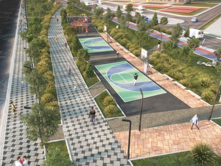 В проектном решении отобразили два поля для стритбола. Площадка для футбола может трансформироваться в поле для волейбола.