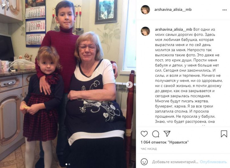 "Это даже не пост, это крик души. Прости меня бабуля и детки, у меня больше нет сил. Сегодня они закончились. И силы, и воля и терпение. Ничего не получается у меня, ни со здоровьем, ни с самой жизнью, я почти дохожу до двери, как она закрывается и сегодня закрылась последняя", - написала Алиса (орфография и пунктуация здесь и далее сохранены - прим.).