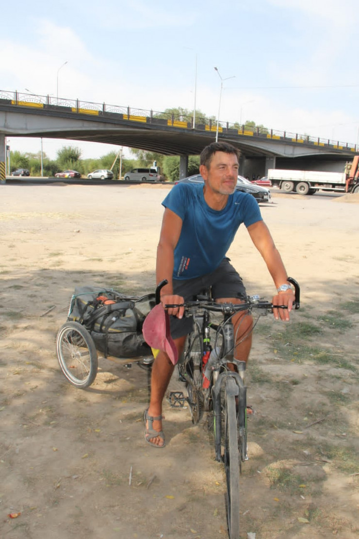 44-летний велосипедист из Франции Лоран Маэ преодолел девять тысяч километров и финишировал в Алматы, передает корреспондент Tengrinews.kz.