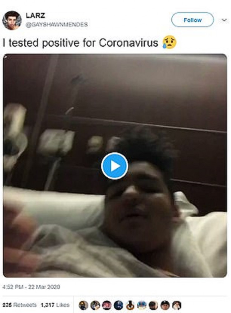 Уже через два дня блогер выложил в соцсети новый ролик, в котором лежал на больничной койке с капельницей и рассказывал о том, что его тест на коронавирус оказался положительным - он заболел COVID-19. Посмотреть этот ролик уже не получится, потому что Larz не только заблокировал свой Twitter-аккаунт, но и удалил все видео в TikTok. Однако западные журналисты успели сделать скриншот.