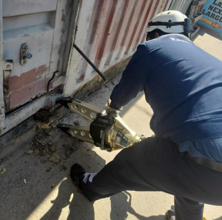 Натянув гидравлический натяжитель между контейнерами, спасателям удалось благополучно достать животное.