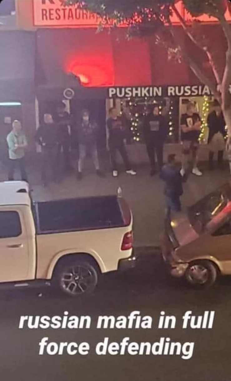 На снимке видно, как мужчины выстроились перед питейным заведением под названием Pushkin Russia. Под фото надпись на английском языке: "Русская мафия в полном составе обороняется".