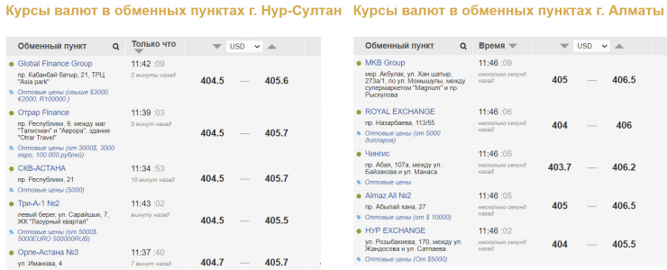 В обменниках Нур-Султана доллар продают по 405,5-405,7 тенге, покупают - по 404,5-404,7 тенге. В обменных пунктах Алматы продажа валюты сложилась на уровне 405,5-406,5 тенге за доллар, покупка - 403,7-405 тенге.