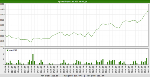 По итогам торгов акциями на бирже, 4 июля 2014 года индекс KASE вырос на 11,41 пункта (один процент) и составил почти 1 160 пунктов (1 157,96). Первая сделка дня зафиксировала значение индекса на уровне 1 148,92. В ходе торгов максимальное значение индекса составило 1 161,05, минимальное - 1 148,92 пункта.