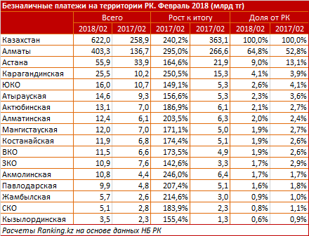 Рост объема безналичных платежей зафиксирован во всех 16 регионах страны. Абсолютным лидером по объему безнала является Алматы - 403,3 миллиарда тенге, рост за год почти в три раза. Доля от РК выросла с 52,8 процента до 64,8 процента.