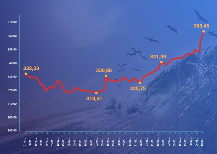В августе тенге ждали новые двухгодичные минимумы. 1 августа курс тенге составил 348,38 за доллар, 2 августа - 349,84. После почти недельного спокойствия, 9 августа тенге резко ослаб до 355,38 за доллар. Уже через четыре дня, 13 августа, была пройдена отметка 360 - курс составил 363,45 тенге за доллар.