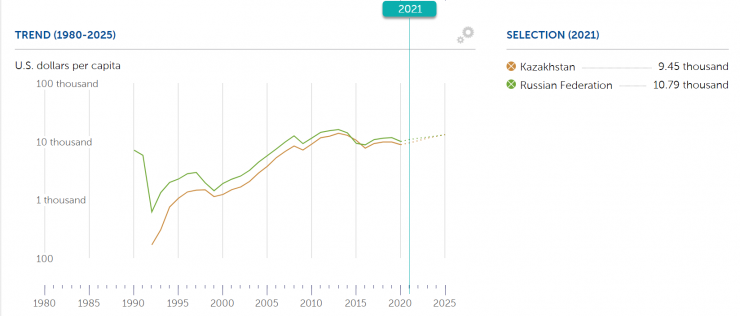 К такому заключению аналитик пришел, основываясь на данных Международного валютного фонда. МВФ отследил статистику роста ВВП обеих стран с 1980 года и сделал прогноз до 2025 года, где Казахстан и Россия оказываются на одном месте по показателям ВВП на душу населения.