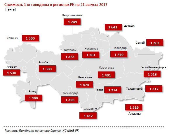 Самые высокие цены на мясо в Казахстане по итогам августа были зафиксированы в Астане. В столице килограмм говядины обходится в 1 641 тенге, что на 17,2 процента выше, чем в среднем по республике. Также в Астане самые дорогие баранина (1 750 тенге за килограмм, выше среднереспубликанского уровня на 26,3 процента) и конина (1 785 тенге за килограмм, +14,9 процента от уровня по РК).