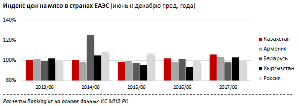 Для сравнения - в Армении цены на мясо за январь-июнь выросли на 3,7 процента, в Кыргызстане на 3,2 процента, в России всего на 0,1 процента. А в Беларуси мясо в этом году подешевело на два процента.