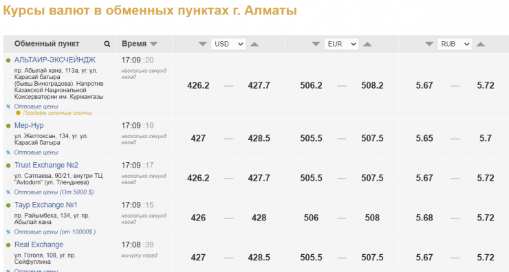 В обменных пунктах Алматы евро продают по 507,5-508,2 тенге, покупают за 505,5-506,2 тенге. Продажа доллара находится на уровне 427,7-428,5 тенге, покупка - 426-427 тенге.
