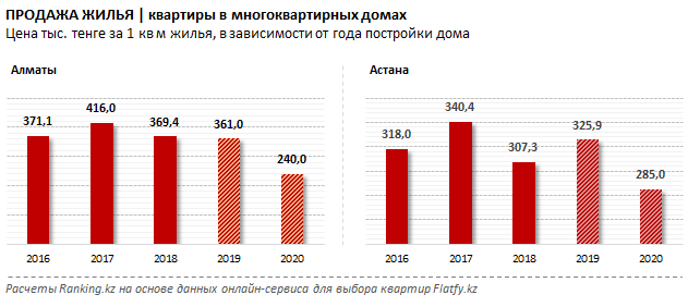 В Астане цена за "квадрат" поднялась до 332,7 тысячи тенге в среднем по итогам апреля. Это +5,7 процента за год.  В Алматы, напротив, цены снизились на 4,6 процента за год, до 325,6 тысячи тенге за квадратный метр.