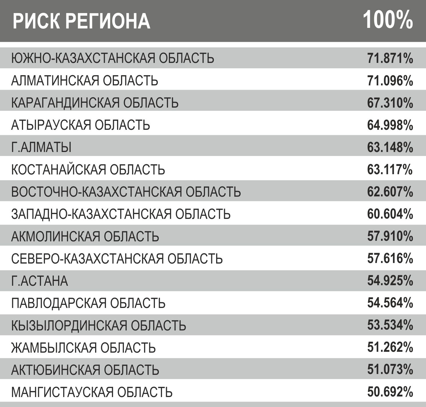 Предпринимательские риски регионов Казахстана были рассчитаны на основе методики компании A. T. Kearney и с использованием данных Агентства Казахстана по статистике за 2013-2014 год. Отмечается, что предпринимательские риски регионов зависят от общего положения дел в областях. Для расчета уровня безопасности регионов для ведения бизнеса в Казахстане брались такие показатели, как объем кредитования населения, доход на душу населения, ВРП (валовый региональный продукт), доля экономически активного населения, показатели роста и спада преступности.