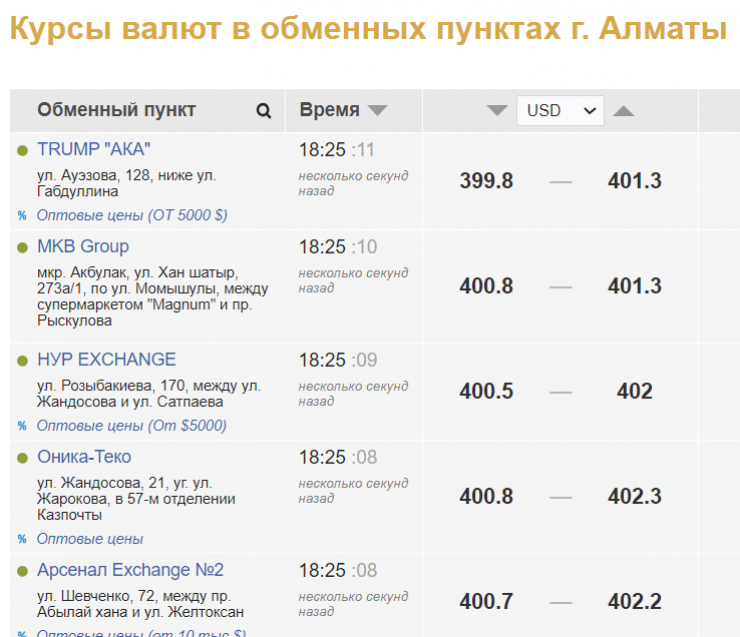 В настоящее время доллар в обменных пунктах Нур-Султана продают за 401-402 тенге и покупают за 400-400,1 тенге. В Алматы обменники продают валюту за 401,3-402,2 и покупают за 399,8-4000,8 тенге. Тем не менее днем продажа валюты доходила до 404 тенге за доллар