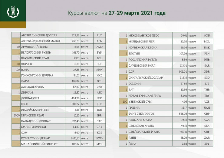 Курс доллара к тенге в выходные и понедельник будет составлять 424,28 тенге. При этом официальный курс доллара на 26 марта составляет 423,45 тенге.