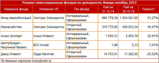 Помимо этого, по их словам, на фоне других инвестиционных инструментов впечатляющую доходность показывают паи инвестиционных фондов. "Наибольший прирост стоимости показал фонд еврооблигаций - 51,3 процента за январь-октябрь 2015 года. При этом порог входа в этом фонде составляет 1,5 миллиона тенге. Высокая доходность инвестиций в ПИФы сопряжена и с высокими рисками таких вложений. Так, например, паи фонда "Даму Инвест" за год упали в цене почти на четверть", - объяснили специалисты.