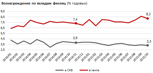 По словам аналитиков, в свете текущих экономических событий вопрос сохранения сбережений и инвестирования свободных средств не теряет актуальности. "Самый популярный и доступный инструмент - банковские вклады - в октябре 2015 года показал среднюю доходность на уровне 8,2 процента по вкладам в тенге и 3,3 процента - в СКВ (свободно конвертируемая валюта). По сравнению с прошлогодними октябрьскими показателями ставки по депозитам в тенге возросли на 0,8 процента, по валютным - снизились на 0,6 процента", - отметили они.